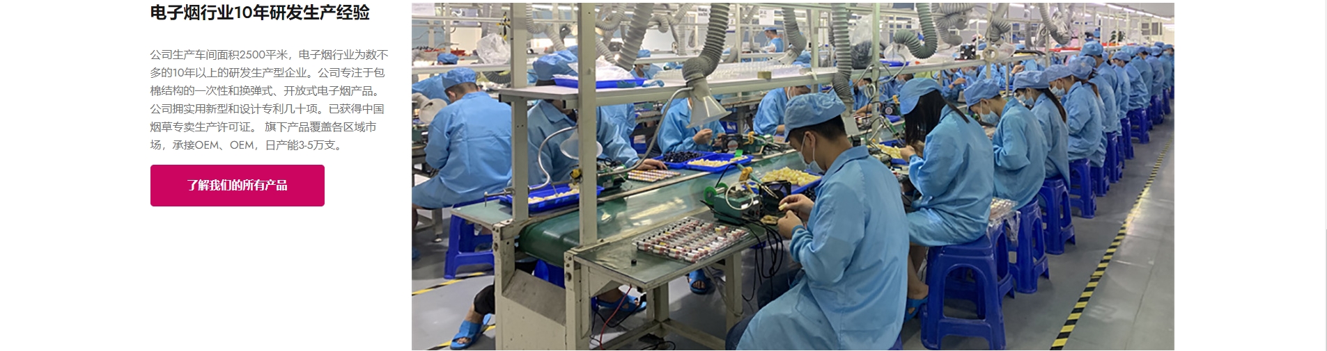我們公司專注于電子霧化器及其零部件的研發制造,以及電子煙產品的生產,電子煙代加工,電子煙貼牌等相關業務,為用戶提供優質值得信賴的品牌電子煙產品,為合作伙伴提供一站式解決方案。公司擁有實力雄厚的電子煙研發團隊人員,獲得多個設計及研發技術專利,同時擁有十萬級潔凈車間,產品通過各種權威認證,品質值得信賴!